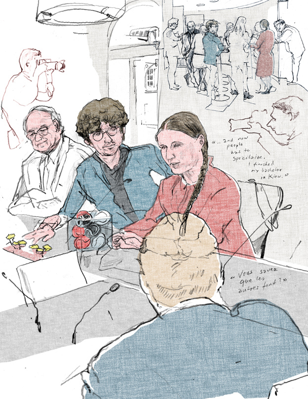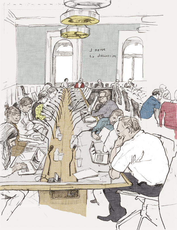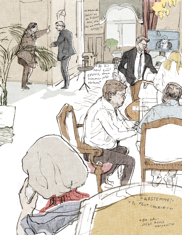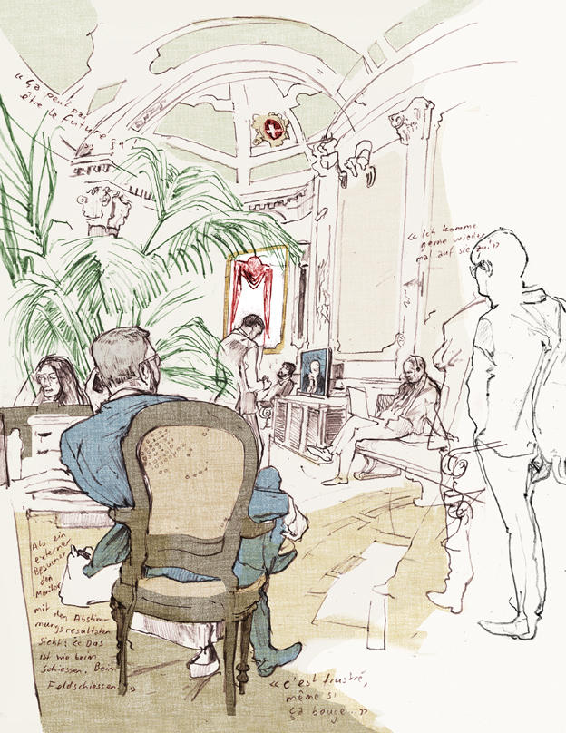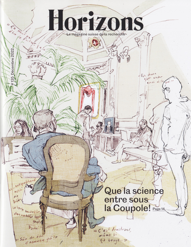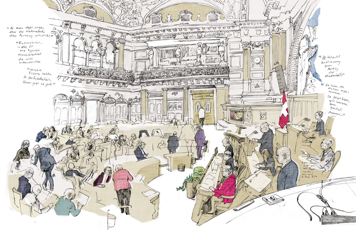 Im September 2022 zeichnete ich für das Magazin des Schweizer Nationalfonds direkt vor Ort im Bundeshaus. Ich hatte Zugang zu beiden Parlamentskammer und zur Wandelhalle, und einmal auch in eine geheime Kommissionssitzung. Fast das ganze Material für die Illustrationen besteht aus Originalzeichnunge oder Fragmenten, die direkt vor Ort entstanden sind. Die handschriftlichen Zitate wurden ebenfalls während der Entstehung der Zeichnungen aufgezeichnet.