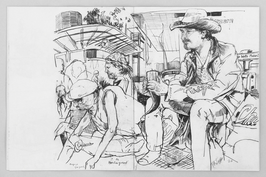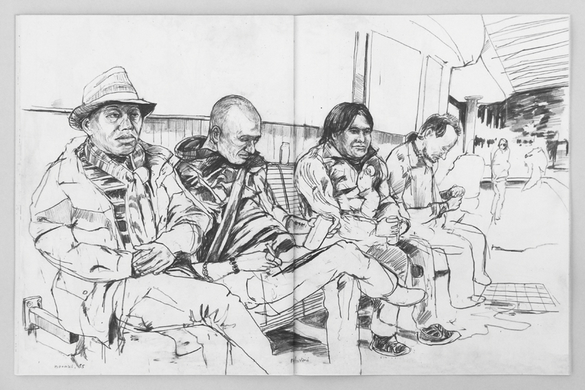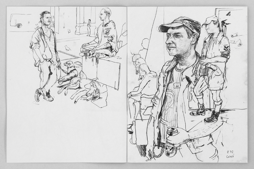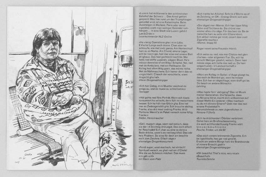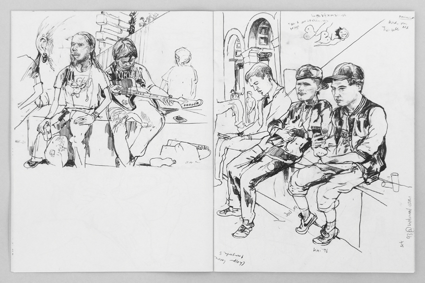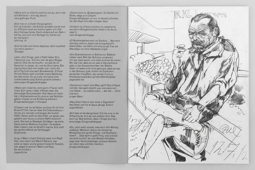 Während eines halben Jahres zeichnete ich fünfundzwanzig Mal vor Ort Jugendliche, Punks, Alkoholiker, Drogenabhängige und